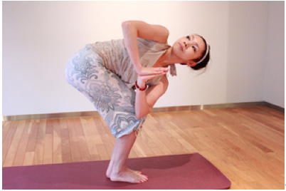 1. 椅子のポーズから膝を曲げたまま肘を腿の外側につけ胸の前(出来る限り胸の中央)で合掌。